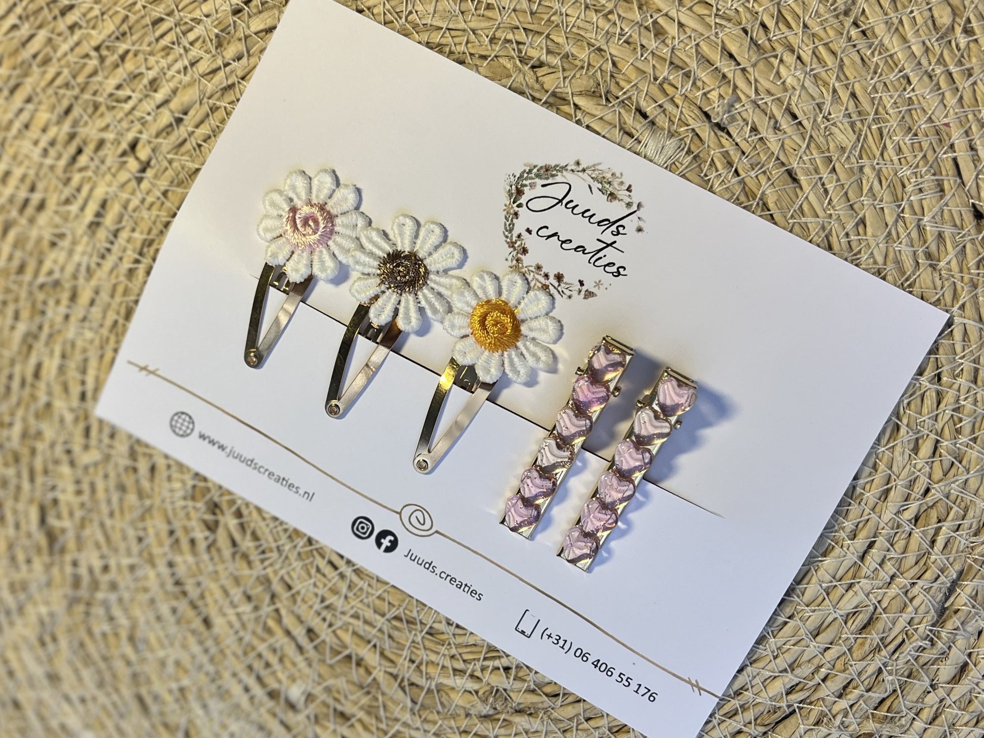 Omdat de webshop is gelanceerd zijn 3 unieke haarclip-sets samengesteld van 5/6cm, met bloemen en hartjes, donuts of aardbeitjes!