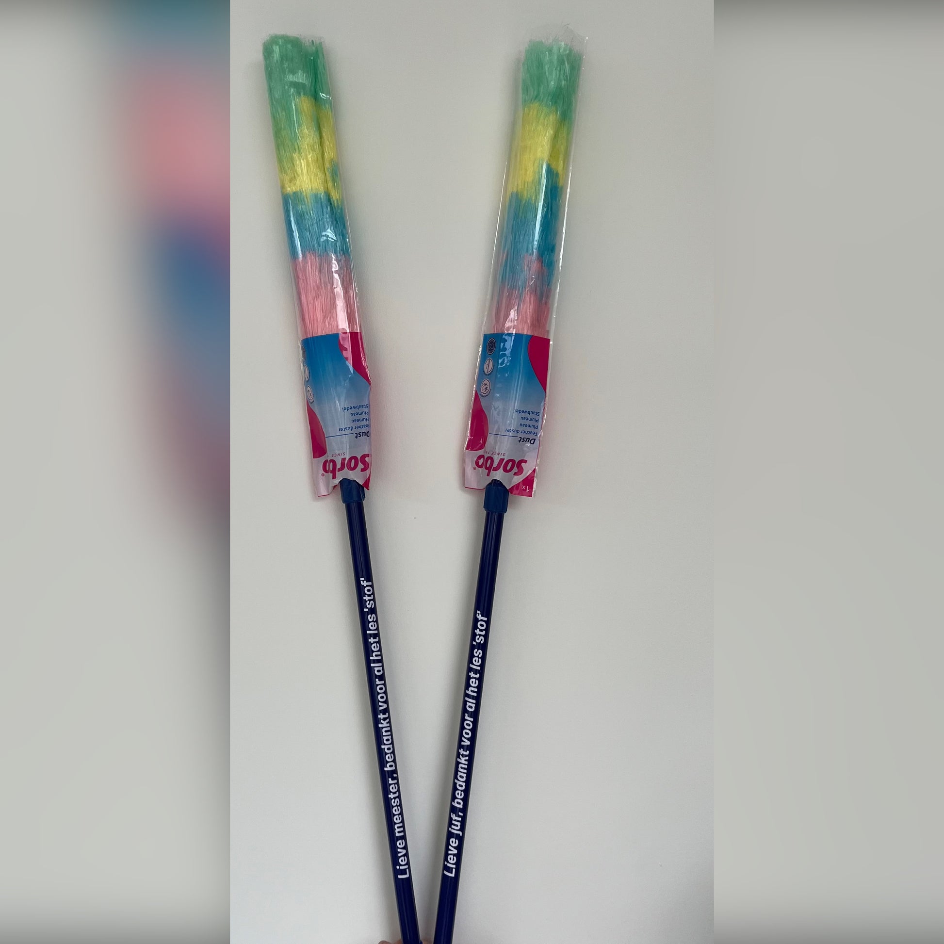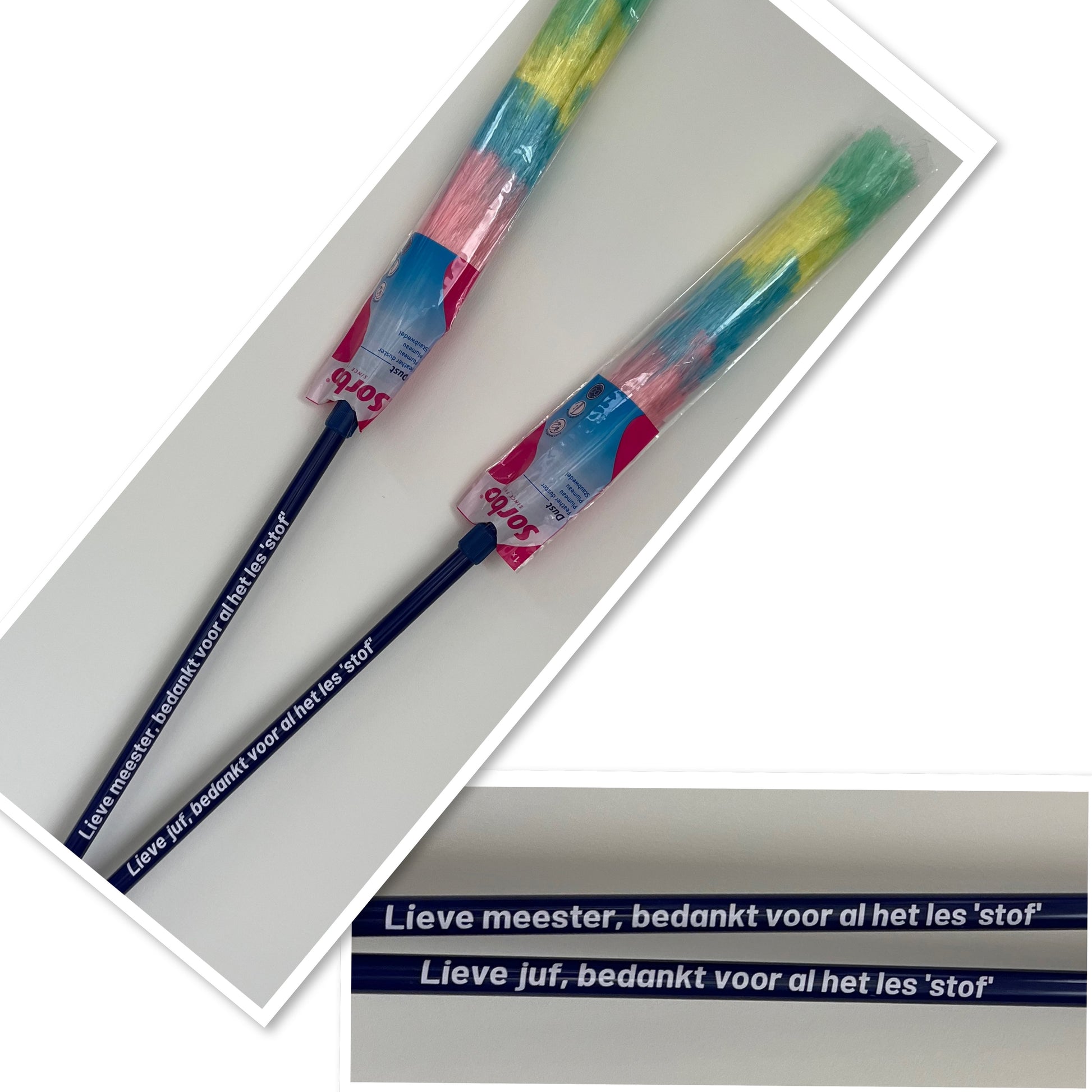 Een plumeau met de tekst ‘Lieve juf/meester bedankt voor al het les ‘stof’