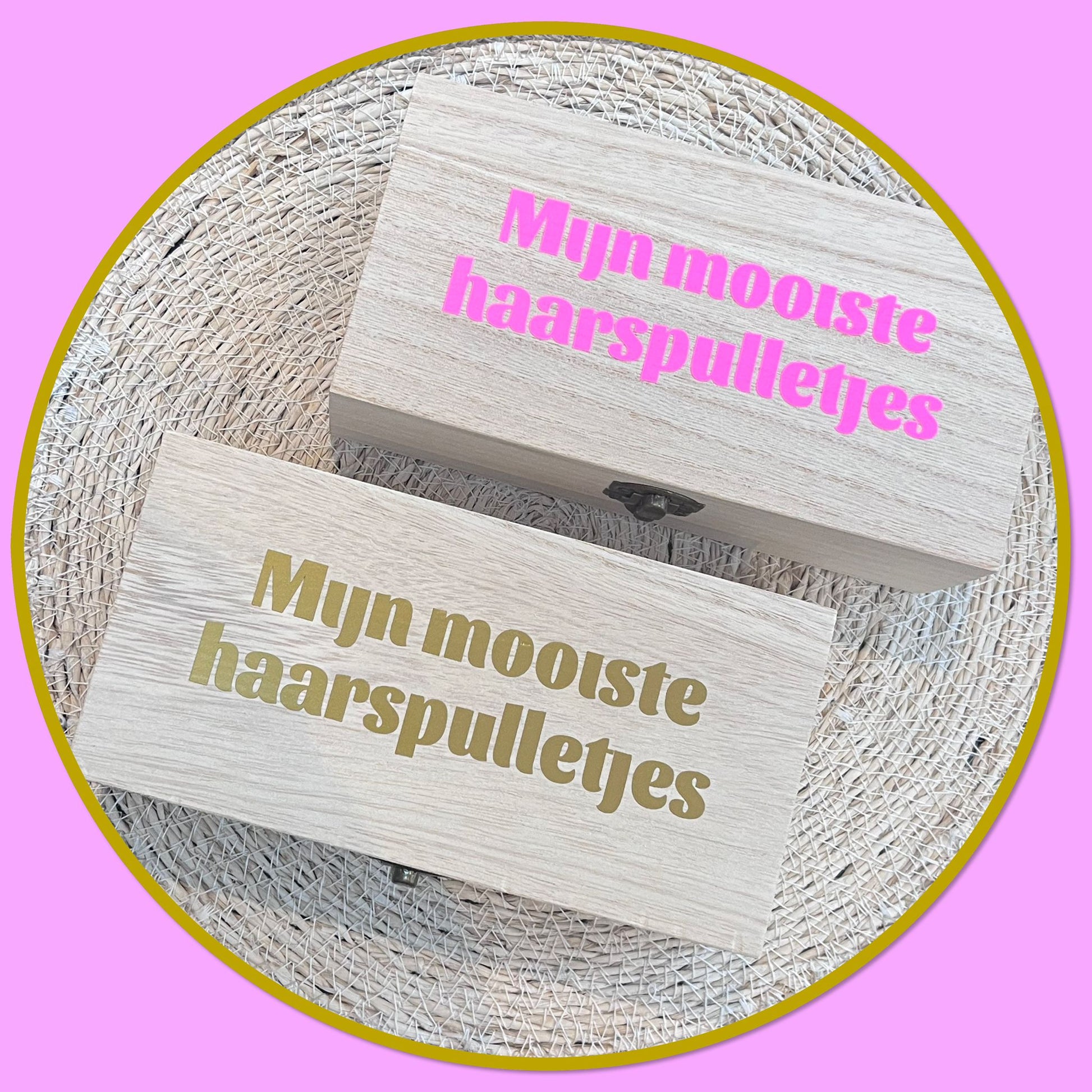 Een vrolijk houten kistje om al jou mooiste haarspulletjes in te bewaren.
