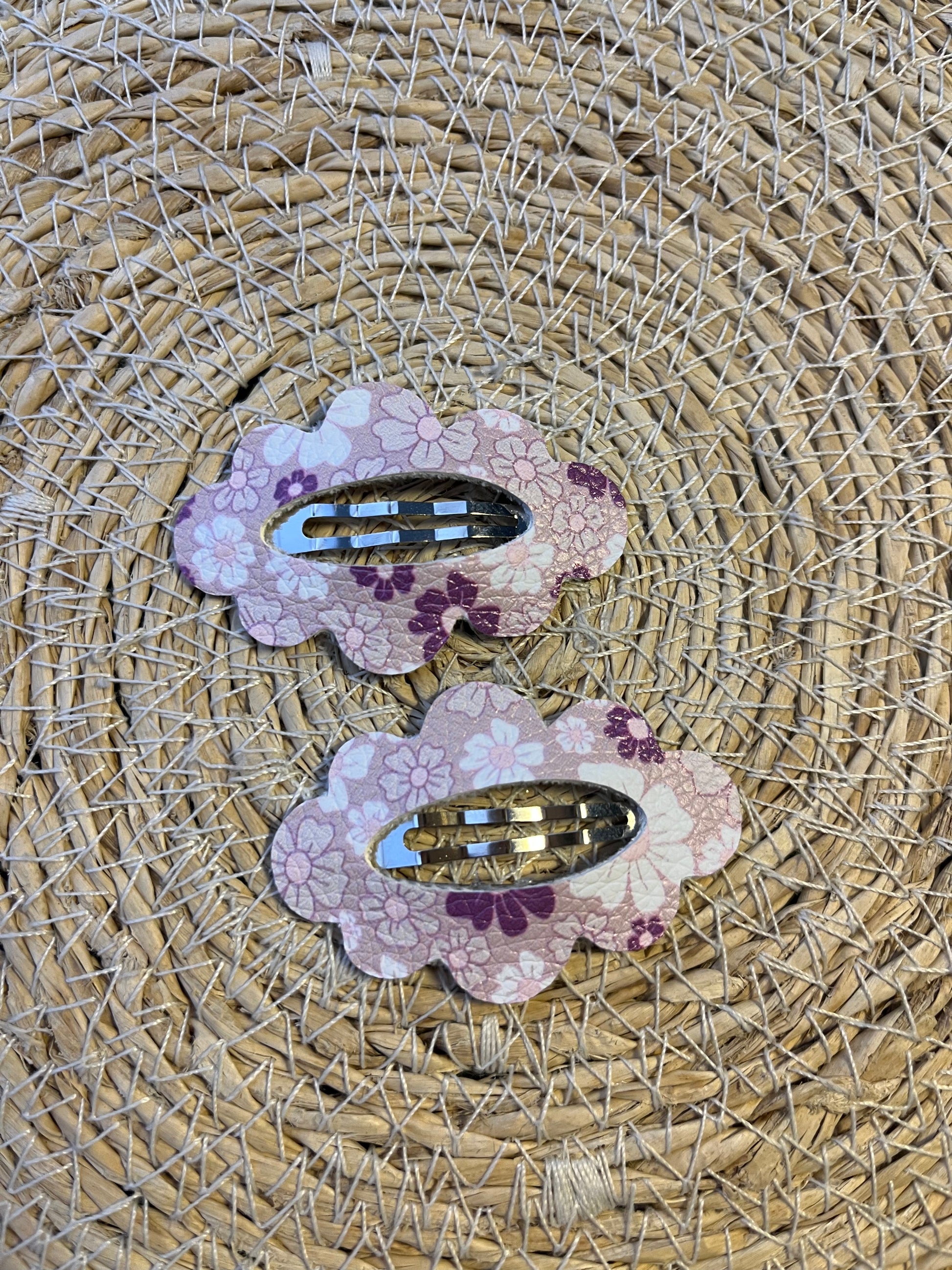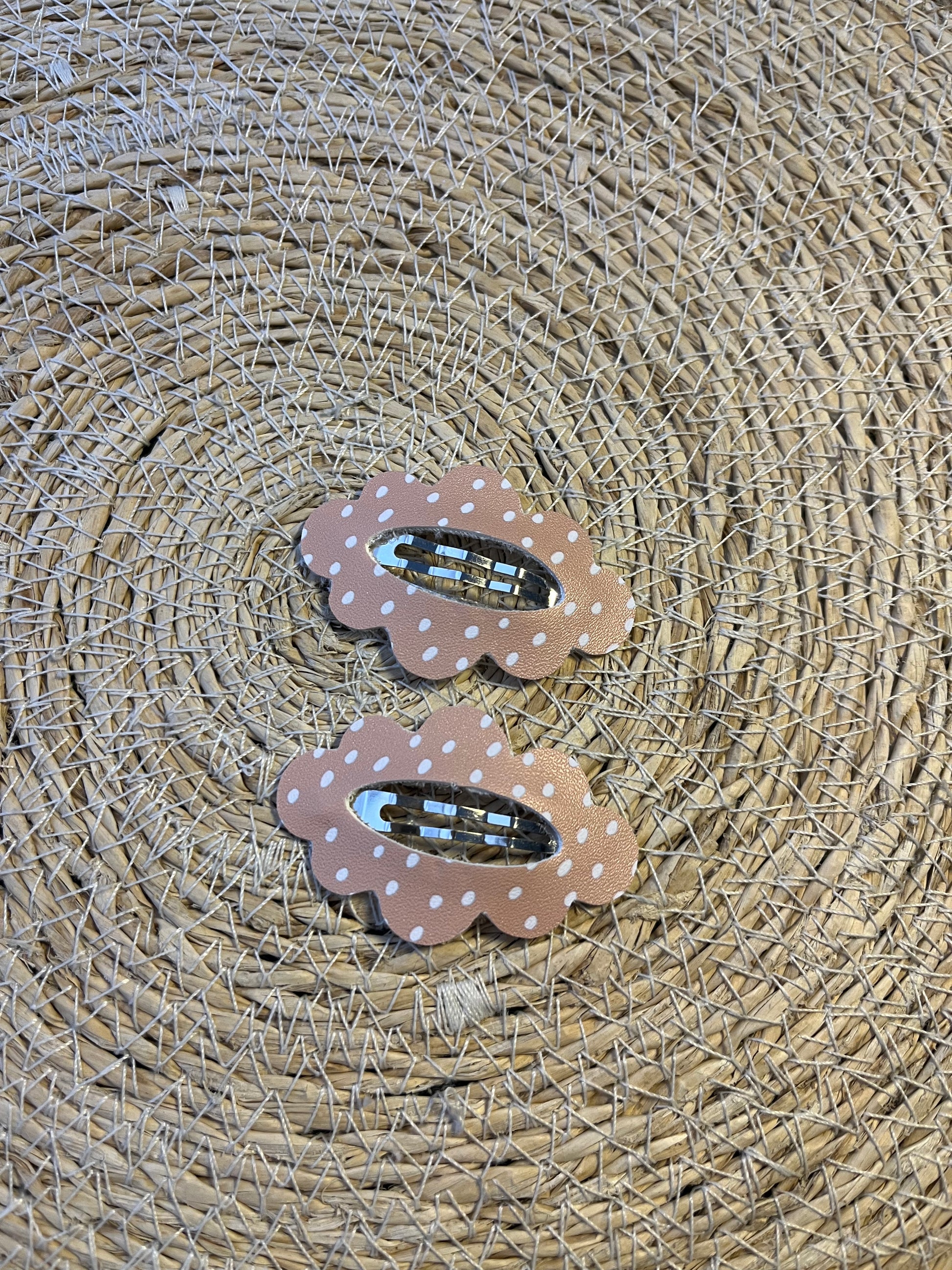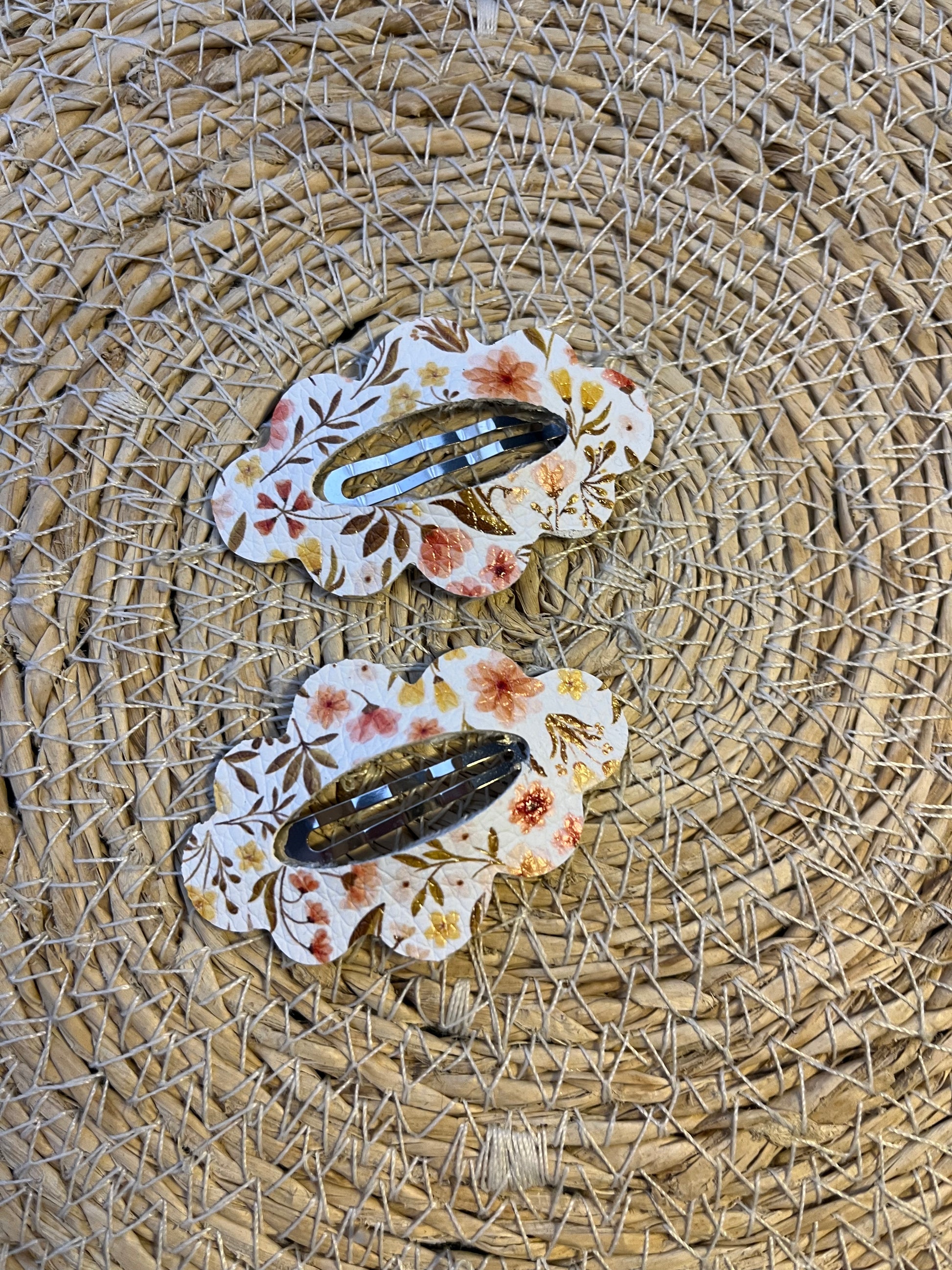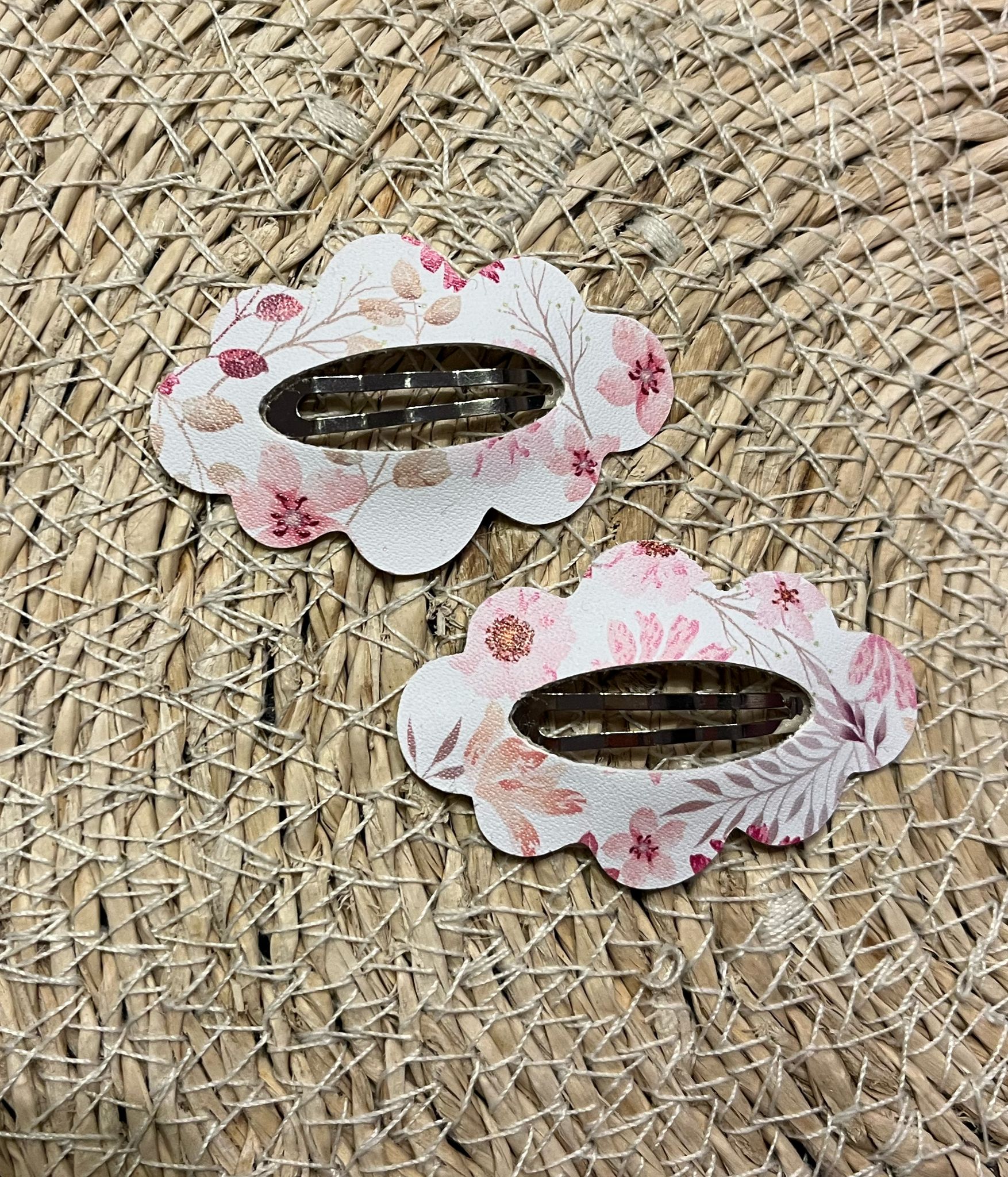 Mooie set van 2 klik-klak haarclipjes met een lengte van circa 6 cm. Verkrijgbaar in een vrolijke bloemenpatroon of effen tint met stippen.