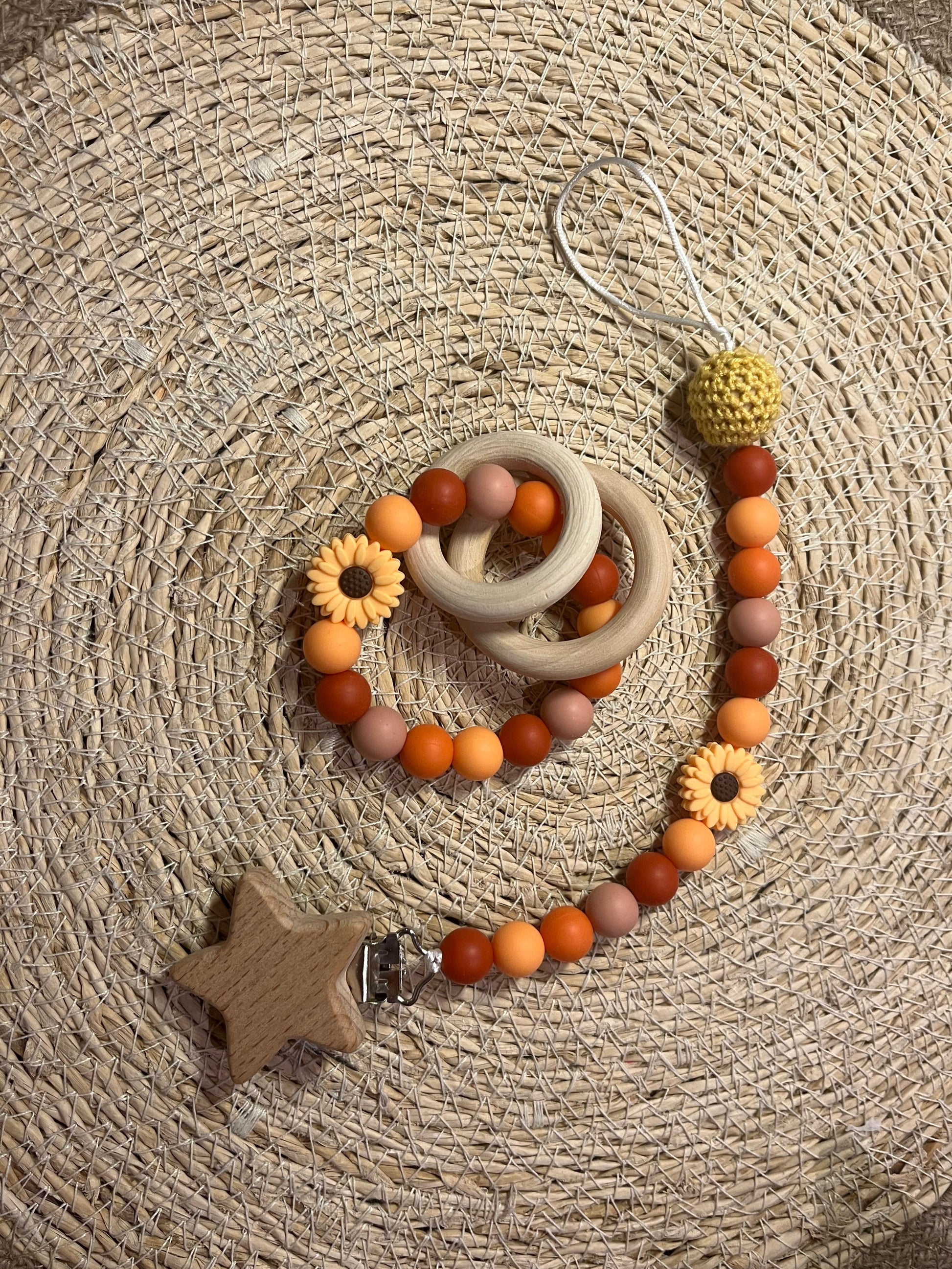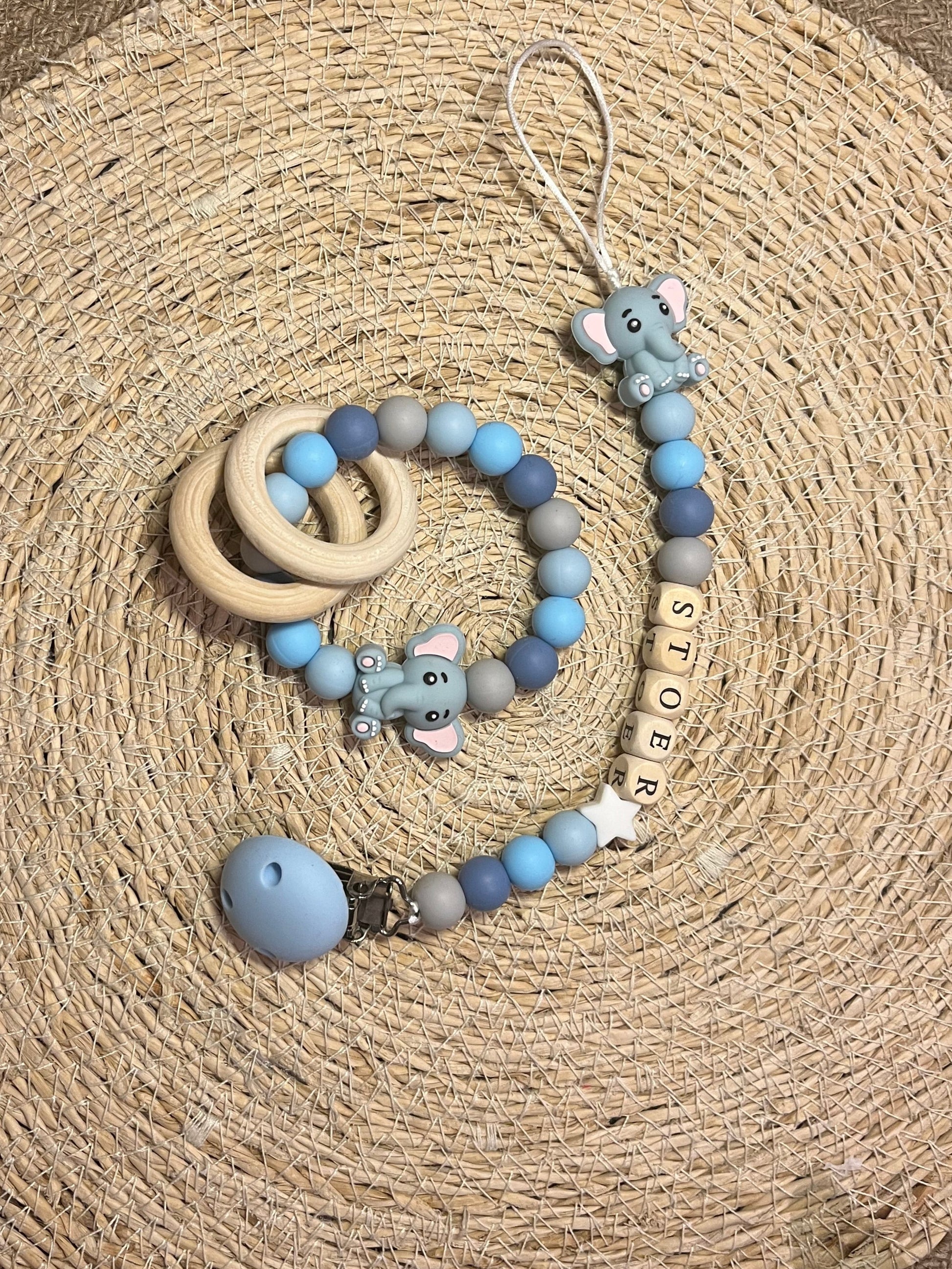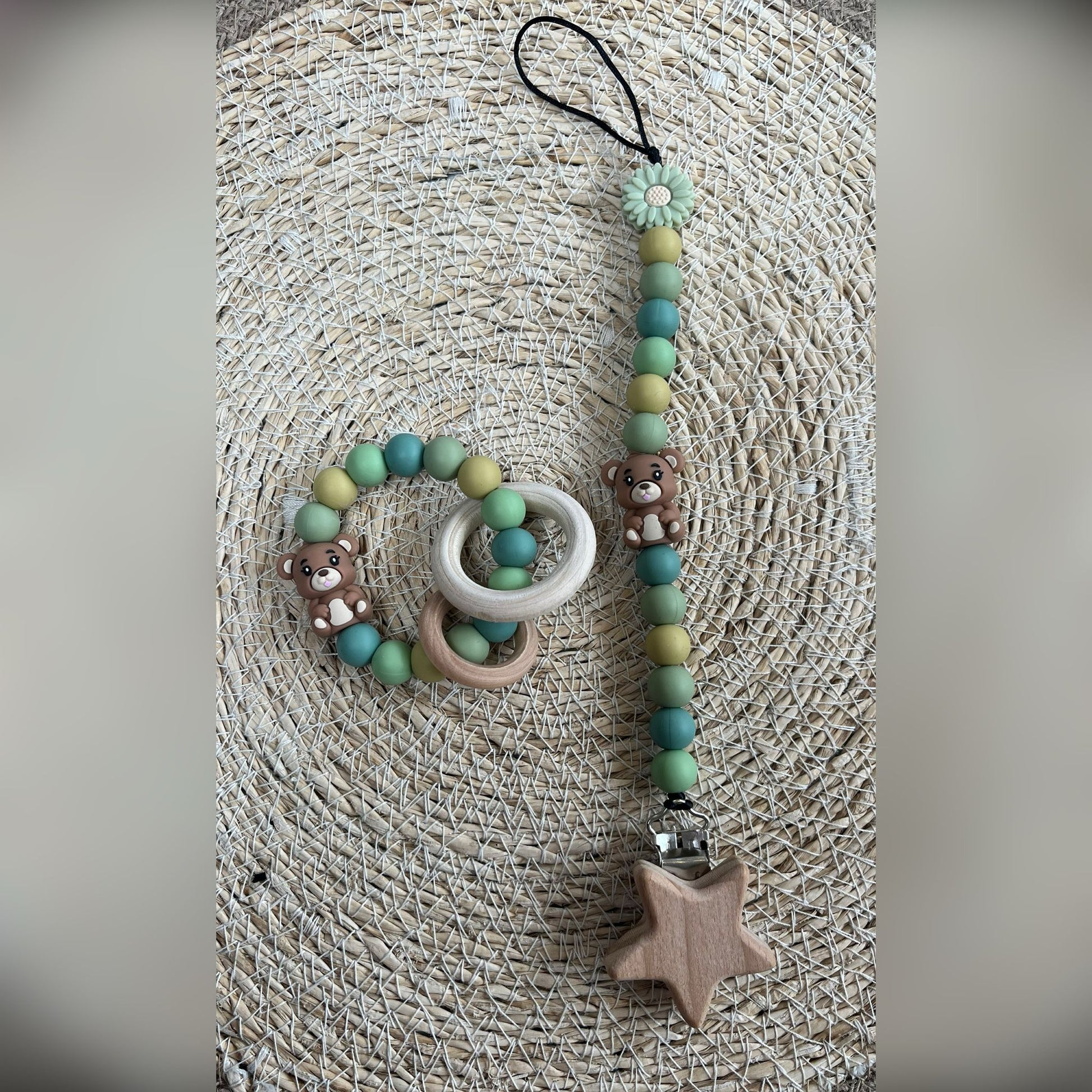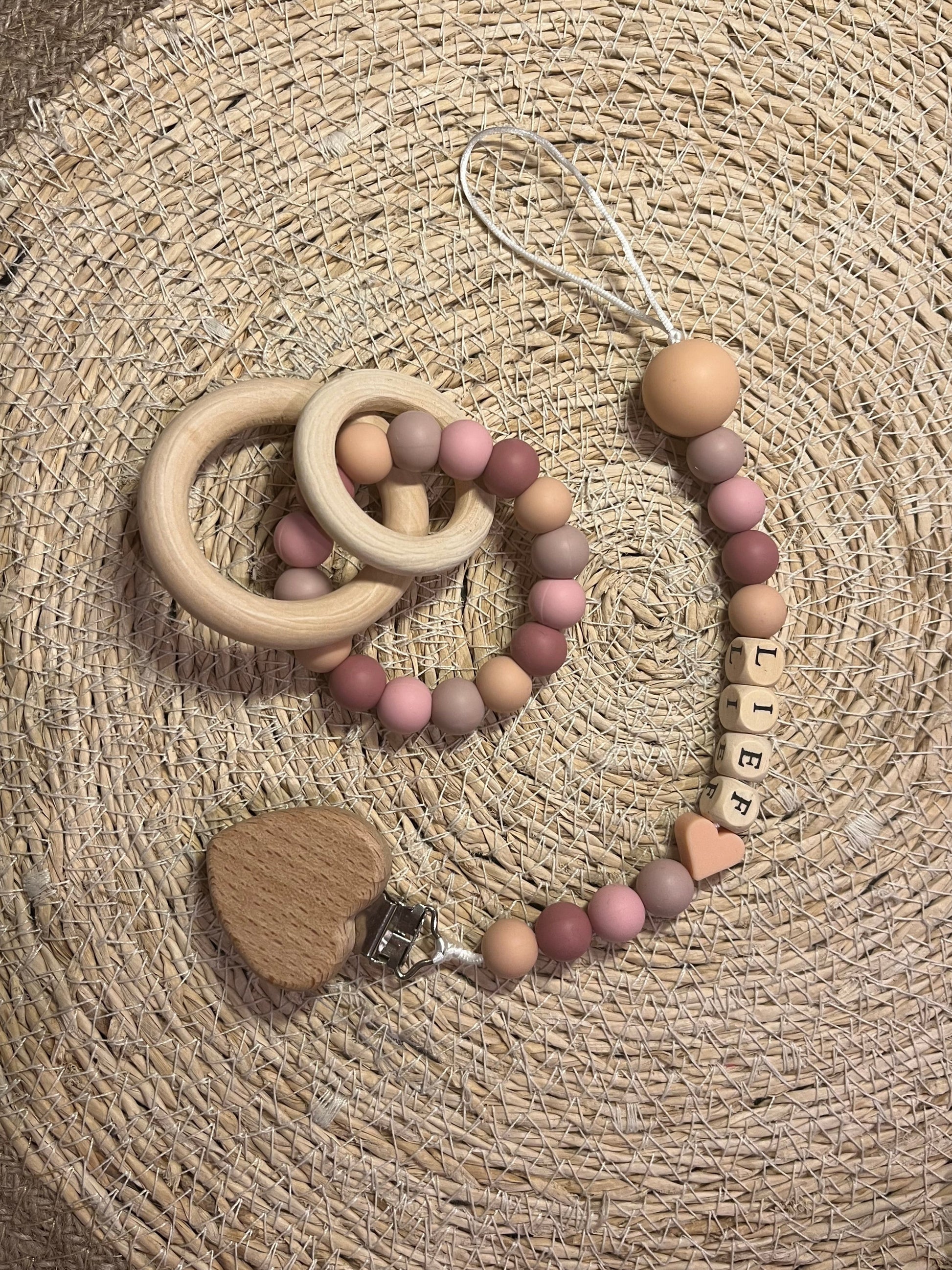 Een mooie unieke set met een speenkoord en bijtring, in verschillende kleuren en samenstellingen leverbaar. Wilt u gepersonaliseerde speenkoord en/of bijtring? Dit kan je toevoegen bij het tekst vlak .