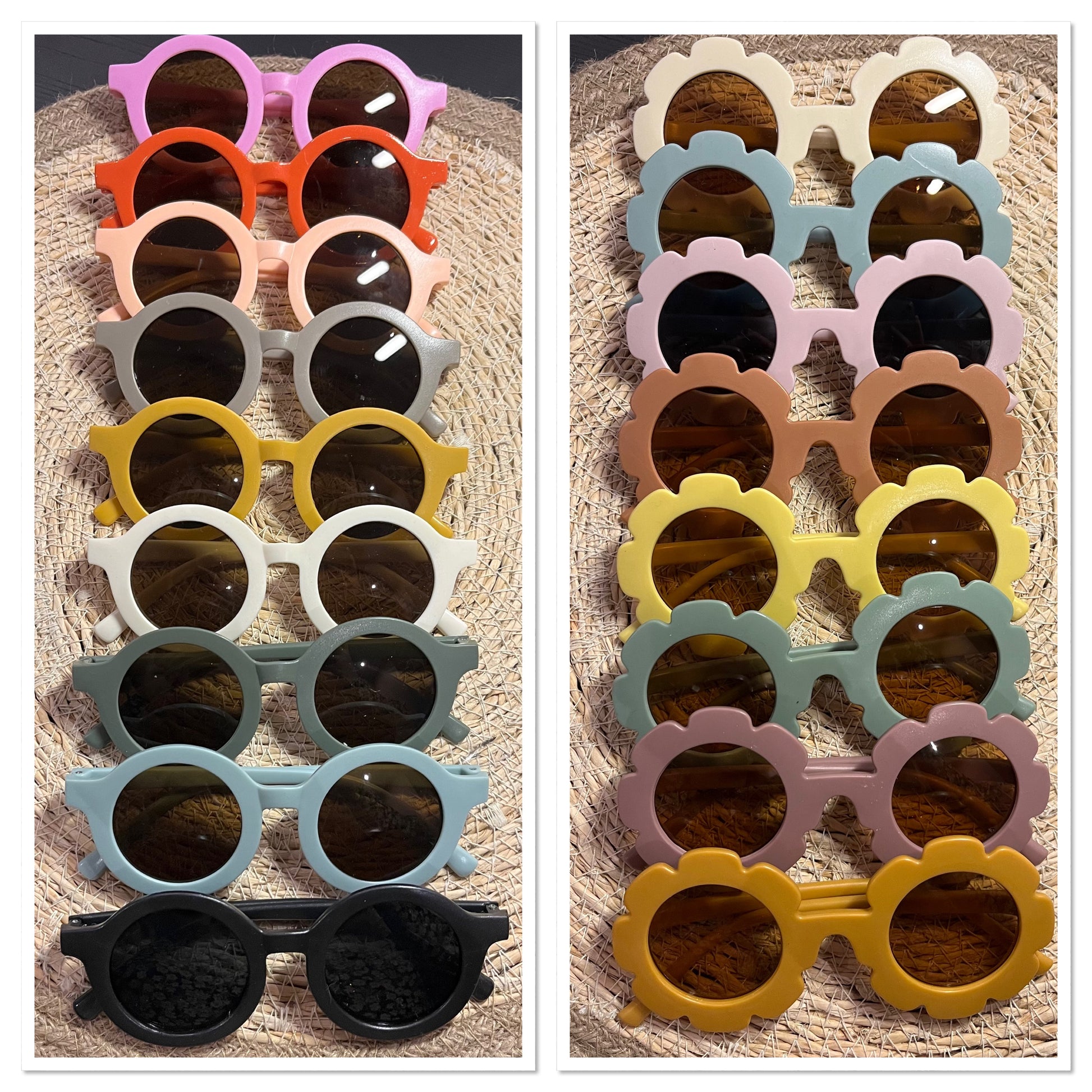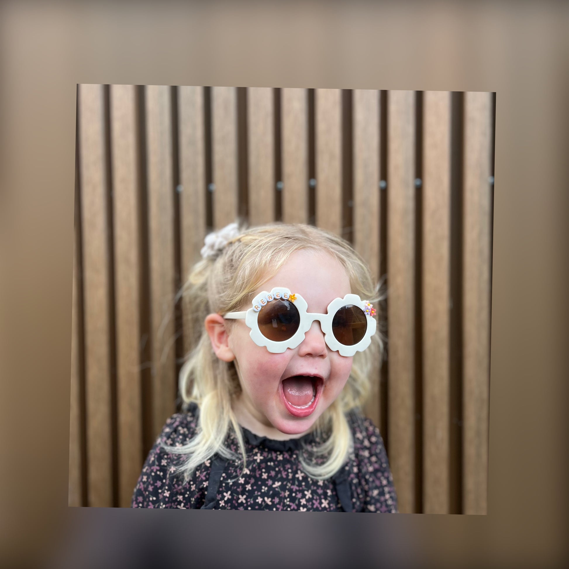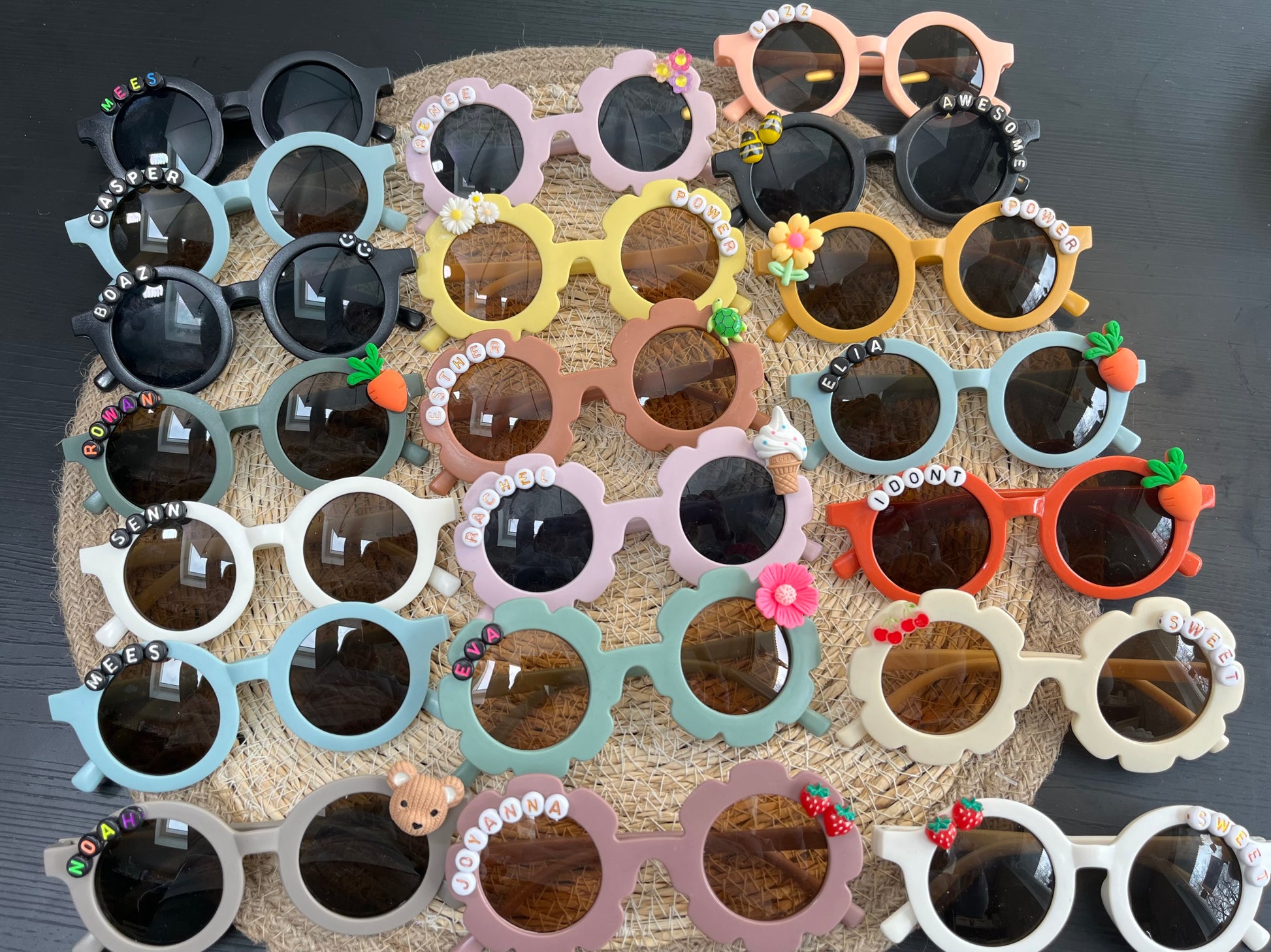 Een hippe zonnebril met naam en/of een figuurtje voor kinderen vanaf 1 jaar. Zie 2e foto voor de kleuren en vormen, zie 3e foto voor inspiratie met figuurtjes. De tekst (naam) en figuurtjes zijn hieronder te specificeren.
